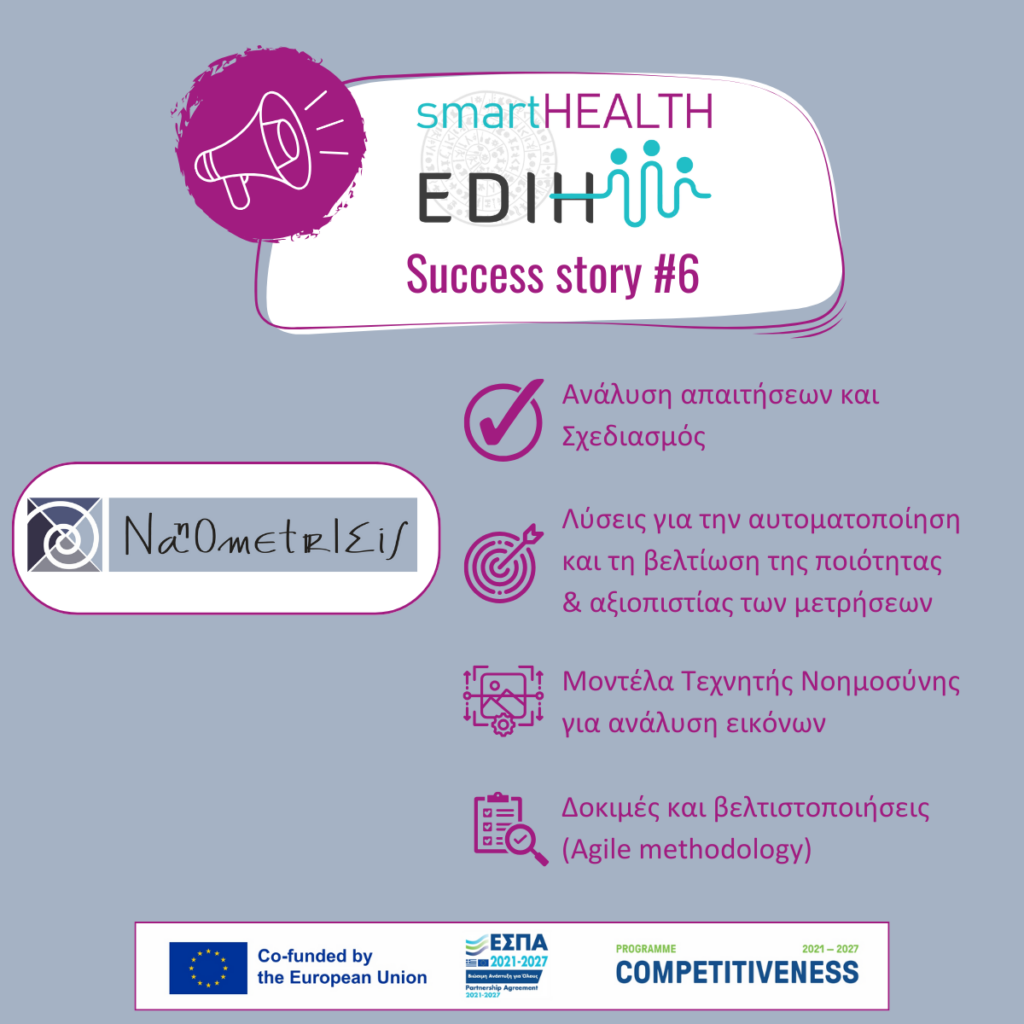 Μια ακόμη επιτυχημένη ιστορία (success story) αποτελεί η συνεργασία της  εταιρείας Nanometrisis και του smartHEALTH. Η Nanometrisis, μέσω της συνεργασίας αυτής, αντιμετώπισε αποτελεσματικά τις ψηφιακές της προκλήσεις, με σκοπό τη βελτίωση της ανάλυσης των εικόνων και τη βελτιστοποίηση των μετρήσεών της, βασιζόμενη σε μοντέλα τεχνητής νοημοσύνης.