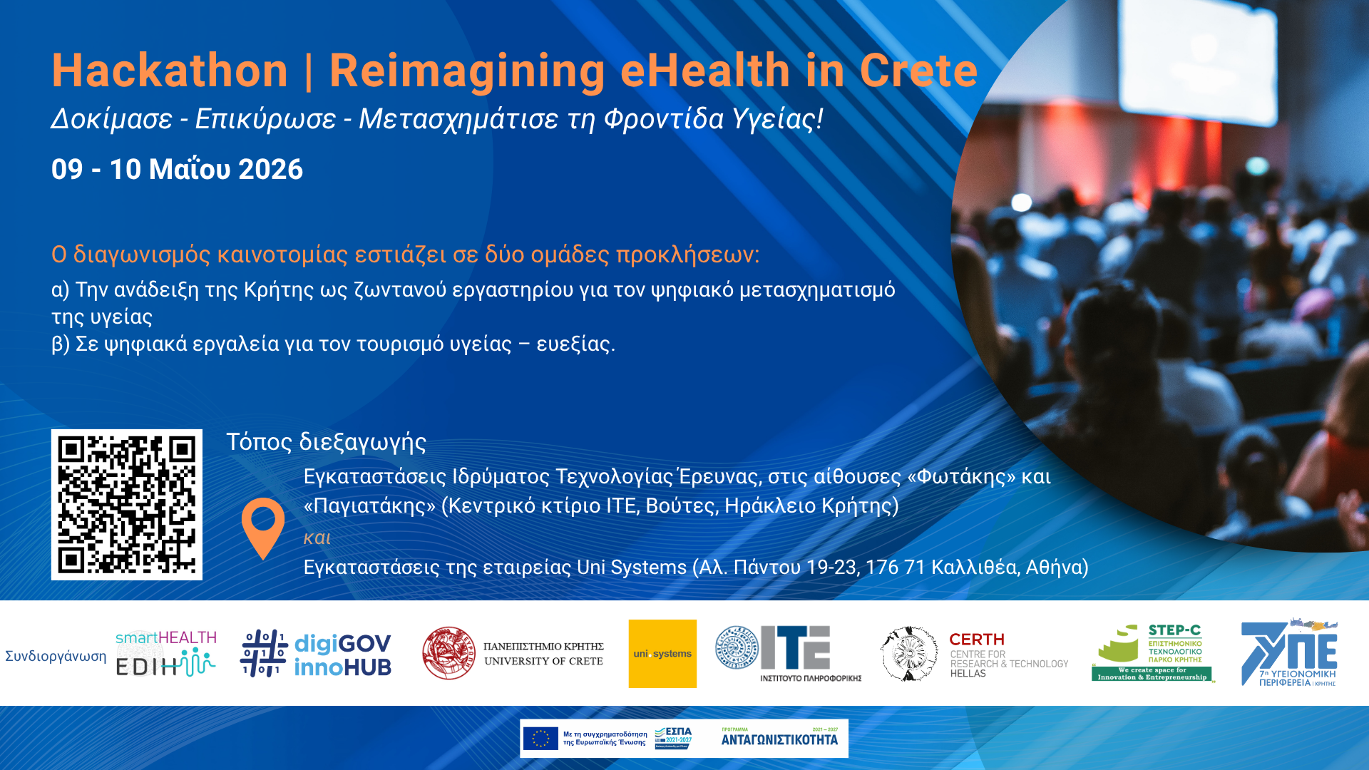Ενημερωτική τηλεδιάσκεψη για τον διαγωνισμό καινοτομίας: Δευτέρα 16/3/2026, 13:00 – 14:30 Τη Δευτέρα 16/3/2026, στο διάστημα 13:00 – 14:30, θα πραγματοποιηθεί, μέσω τηλεδιάσκεψης, ενημέρωση για τον επικείμενο διαγωνισμό καινοτομίας (hackathon) με τίτλο «Reimagining eHealth in Crete». Ο διαγωνισμός θα πραγματοποιηθεί 9 και 10 Μαΐου 2026, με φυσική παρουσία σε Ηράκλειο και Αθήνα και  αποτελεί μία […]