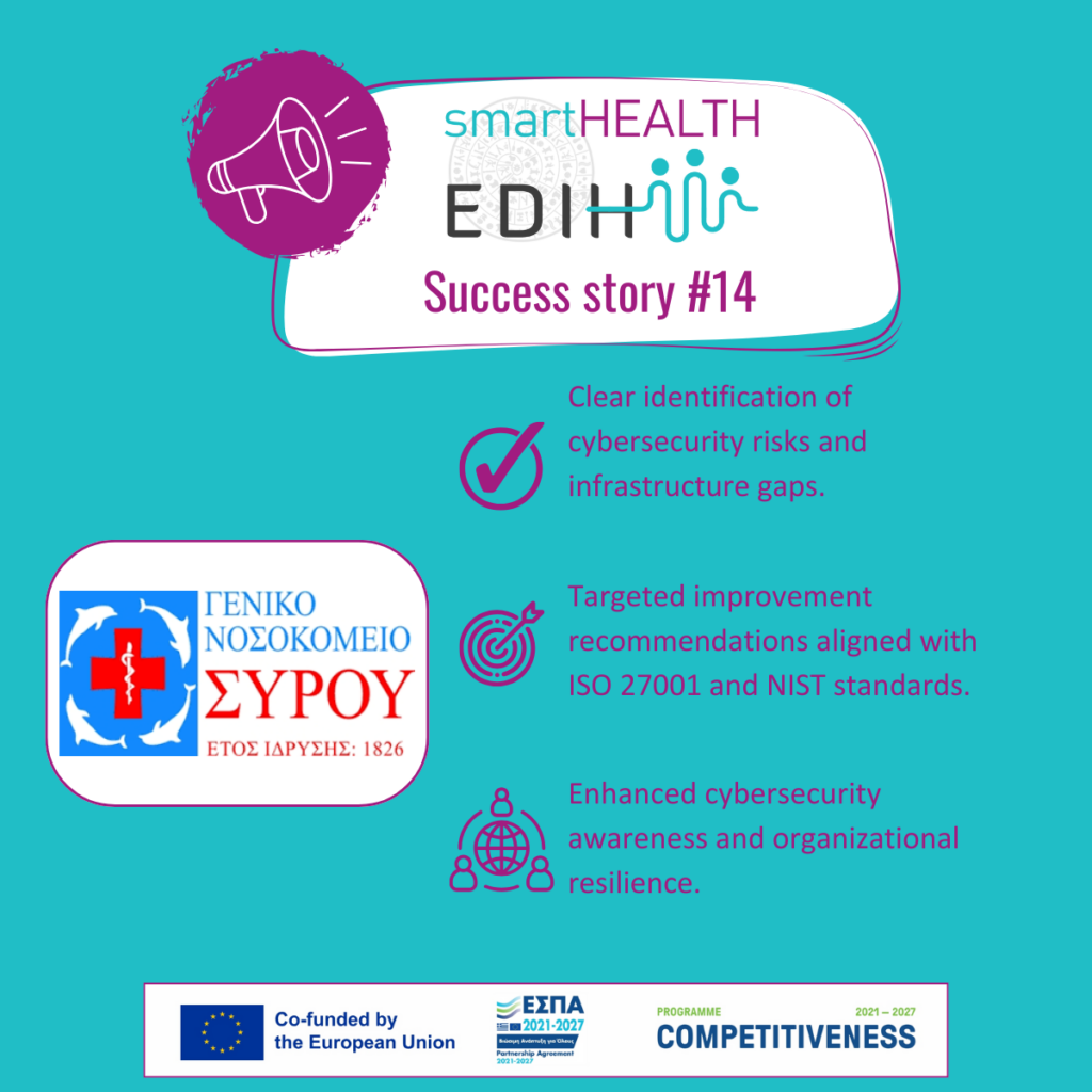 The overall project delivered significant benefits to the General Hospital of Syros, enhancing the security of its information infrastructure and the protection of sensitive data. Through systematic assessment and analysis of existing infrastructures, the organization gained a comprehensive understanding of its vulnerabilities and will be able to implement specific measures to prevent cyberattacks and data breaches. Compliance with international standards such as ISO 27001 will improve risk management and strengthen confidence in safeguarding personal and medical information. Additionally, guidelines were provided for the continuous improvement of security policies and procedures, ensuring the hospital’s long-term sustainability and resilience against future threats.